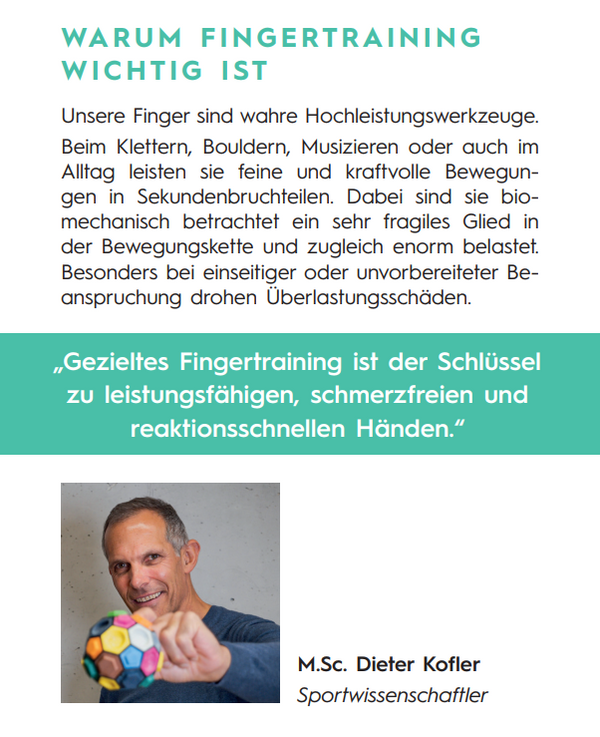 Der Trainingsplan kombiniert Boulderball-Übungen mit gezielten Fingerübungen. Er ist in kurze, effektive Einheiten unterteilt und eignet sich für Einsteiger:innen und Fortgeschrittene.